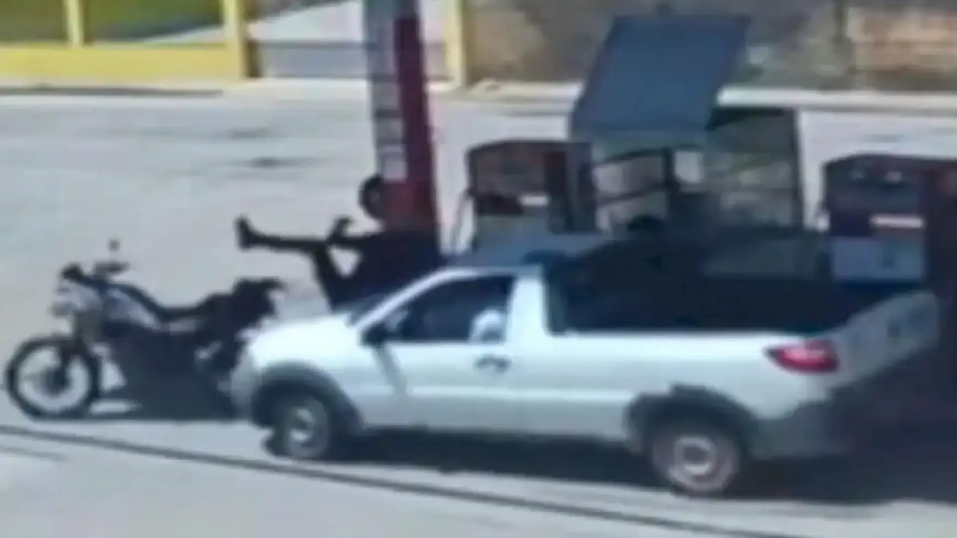 Собственик на магазин е преследвал и блъснал двама крадци малко след като те го ограбили. Камера за видеонаблюдение е запечатала момента, в който престъпниците, каращи мотоциклет, са блъснати от кола, докато преминават покрай бензиностанция по време на бягството си.